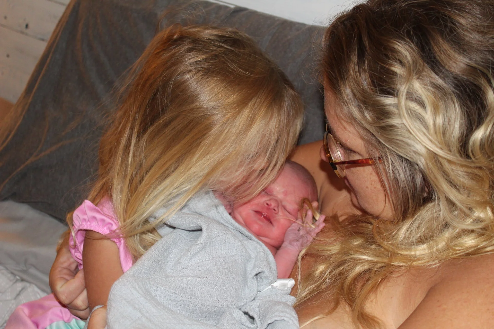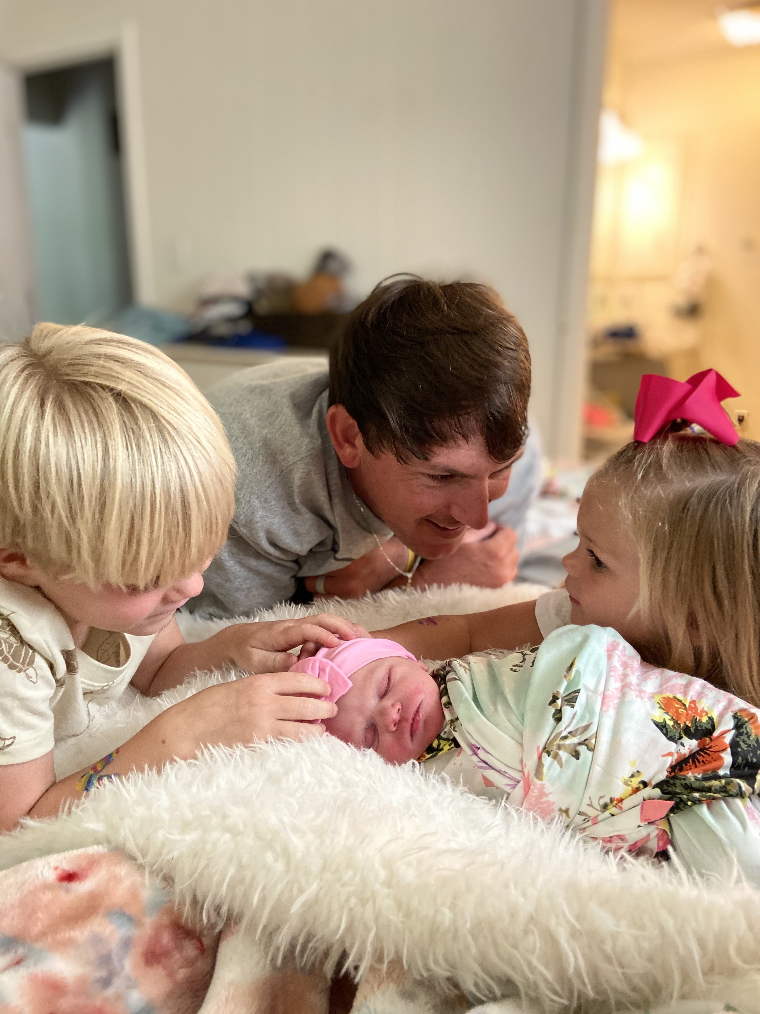 We eventually made our way to our bed for recovery. I cannot even begin to tell you what it is like to recover in your own home. So comfortable and peaceful. Sawyer didn’t leave my skin for over an hour. During this time each of her siblings awakened and came to meet and cuddle her. It was absolutely the BEST morning. After awhile Justin was able to do some skin to skin with Sawyer while I showered. Then we all climbed back in to bed together while Tanashia did the newborn exam and checked over little Sawyer. After a few hours our birth team left, and we were able to enjoy the day with rest, family, and friends. My kids went to stay with my mom for the night. We had a very relaxing and quiet night. Sawyer slept and nursed like a champ. We started to settle in as a family of five.
